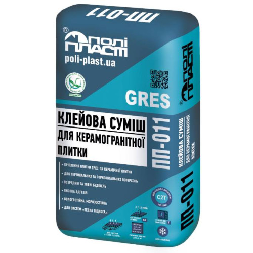 Полипласт ПП-011 Gres, Клеевая смесь для керамоганитной плитки, 25 кг Клеевая смесь ПП-011 GRES предназначена для облицовки вертикальных и горизонтальных оснований керамической и керамогранитной (гресс) плиткой, плитами из натурального и искусственного камня как внутри, так и снаружи зданий (на горизонтальные основания укладывать плитку размером до 450х450 мм, на вертикальные — до 30 мм). Также может использоваться для укладки плитки в системах «теплый пол». Клеев..