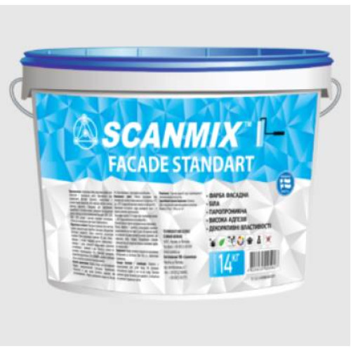 Краска Scanmix Facade STANDART Атмосферостойкая акриловая краска для наружных и внутренних работ. Предназначена для окраски фасадов зданий, износостойких и влагостойких покрытий. Имеет хорошую адгезию и высокую кроющую способность. Пригодна для окраски цементных и гипсовых оснований, силикатного и керамического кирпича, бетона, систем теплоизоляции фасадов, ДВП, ДСП, QSB и OSB, дерева и обоев внутри помещений. Устойчива к атмосферным воздействиям. Паропроницаемая. РАС..