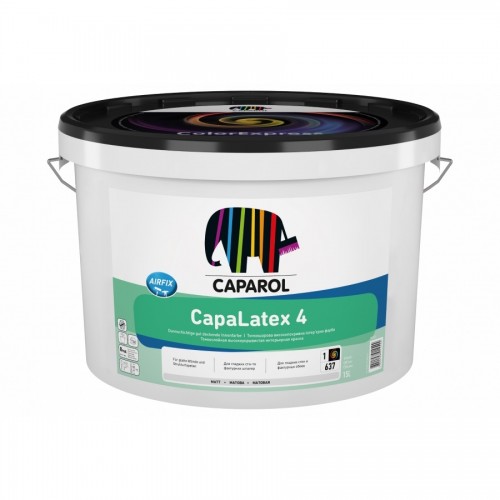 Caparol CapaLatex 4 - Матовая, стойкая к мойке, ультратонкая интерьерная краска для создания прочных покрытий на гладких или фактурных основаниях внутри помещений. Расход: 110 мл/м² на 1 слой.