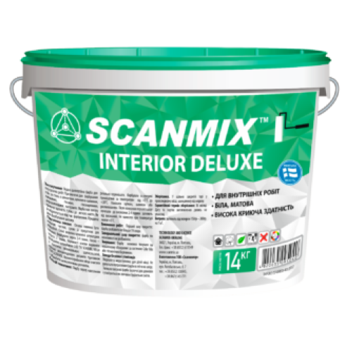 Scanmix INTERIOR DELUXE Водно-дисперсионная краска для внутренних работ. Предназначена для окраски стен и потолков из цементных, цементно-известковых, известковых, гипсовых, гипсокартонных, древесных материалов. Краска имеет высокую кроющую способность. Устойчива к легкому протиранию. Не разбрызгивается во время окрашивания. Пригодна для окраски обоев. ВЫПОЛНЕНИЕ РАБОТ: Первый слой покрытия: краску разбавить не более 5% водой. Завершающий слой покрытия: краску по..
