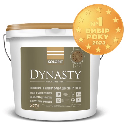 Kolorit Dynasty – Шелковисто-матовая, особенно стойкая к мойке, латексная краска на акрилатной основе для внутренних работ. Ведро – 0,9 л. Расход до 12 л/м2