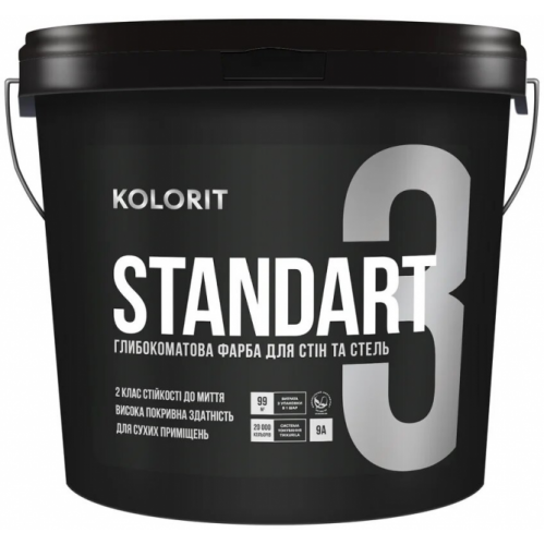 Kolorit Standart 3 – Абсолютно матовая, стойкая к мытью латексная краска на акрилатной основе для внутренних работ. Ведро – 0,9 л. Расход до 11 л/м2