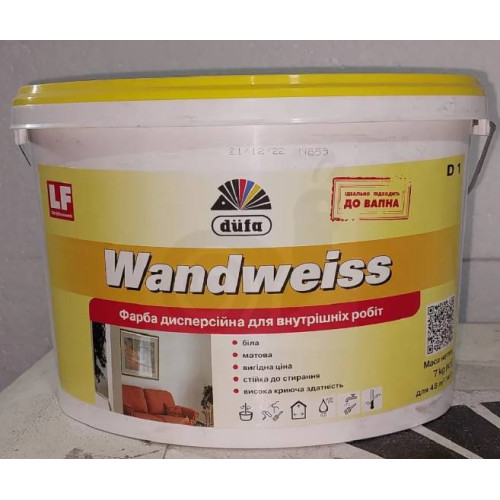 Dufa - Wandweiss D1 – Краска дисперсионная применяется для окрашивания стен и потолков (штукатурки, бетона, кирпича, гипсовых поверхностей, также ДВП, ДСП, обоев, в том числе из волокна "рауфазер"). Среди преимуществ - высокая укрывистость, устойчивая к истиранию поверхность, которая не допускает влажной обработки и повторного перекрашивания.