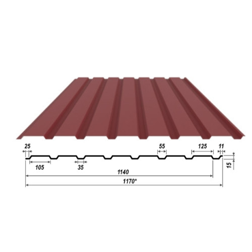 | ПК-15 матовый | Полиэстер матовый | RAL 3009, RAL 3005, RAL 6020, RAL 6005, RAL 8019, RAL 8017, RAL 8004, RAL 7024, RAL 3011, RAL 6002, RAL 5005, RAL 1003, RAL 1015, RAL 9006, RAL 9003 | Кровельный | 0,4 / 0,45 / 0,5 | 160 | 1140 | 15 | 1170 | Китай, Европа |