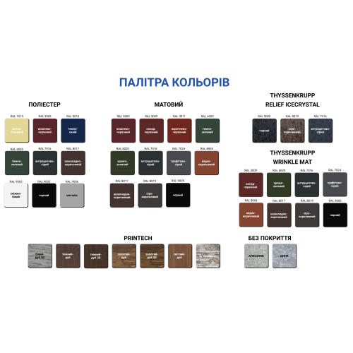 | ПС-18 матовый | Полиэстер матовый | RAL 3009, RAL 3005, RAL 6020, RAL 6005, RAL 8019, RAL 8017, RAL 8004, RAL 7024 | Стеновой, Для забора | 0,4 / 0,45 / 0,5 | 165 | 1128 | 18 | 1190 | Китай, Европа |