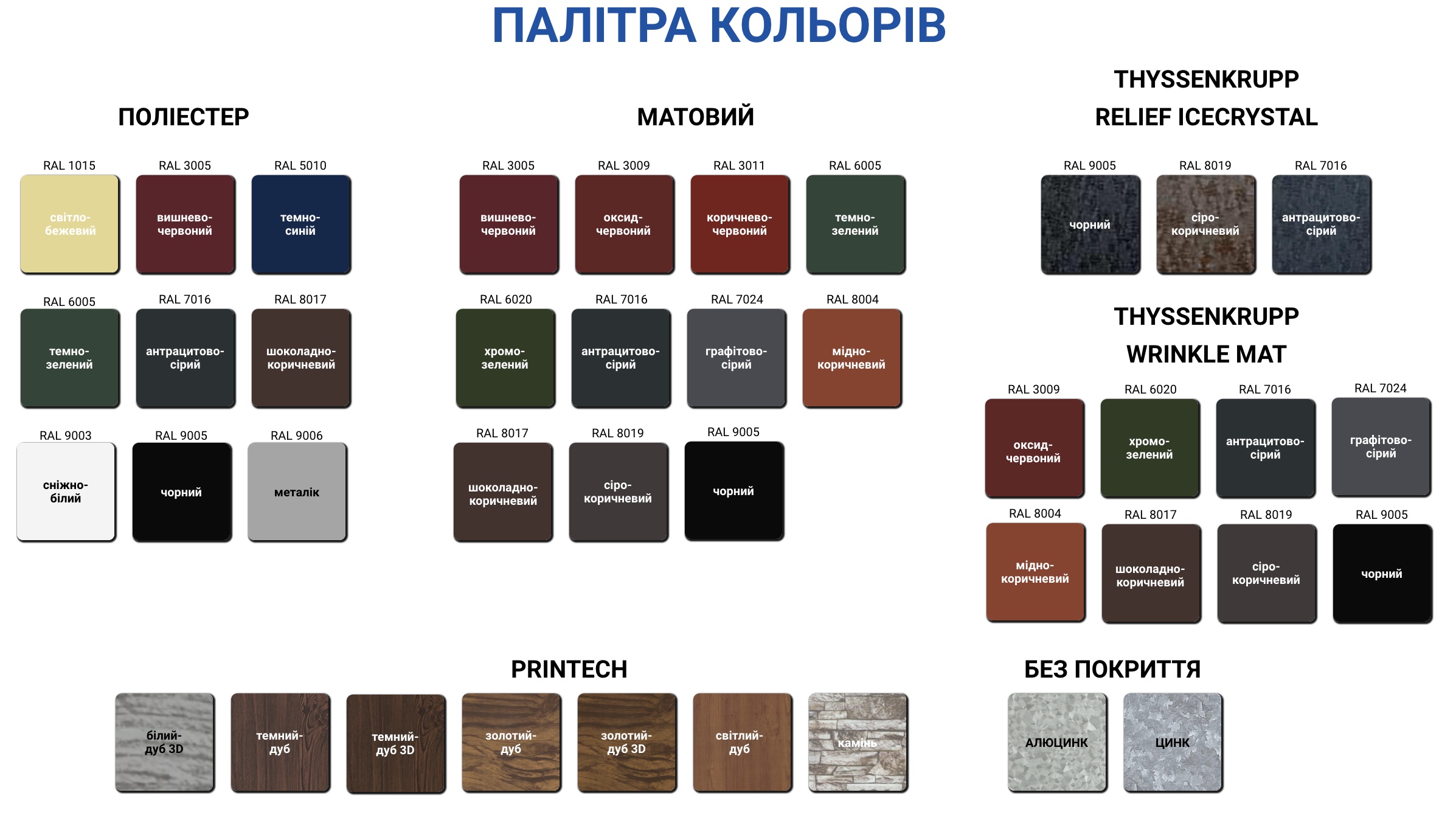 | ПС-10 матовый | Полиэстер матовый | RAL 3009, RAL 3005, RAL 6020, RAL 6005, RAL 8019, RAL 8017, RAL 8004, RAL 7024 | Стеновой, Для забора | 0,4 / 0,45 / 0,5 | 105 | 1140 | 10 | 1200 | Китай, Европа |