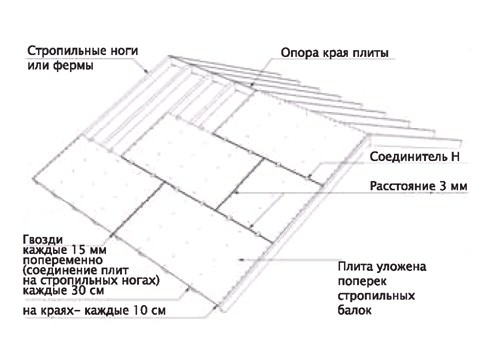 Перед монтажом обшивки следует проверить на сколько стропильные ноги или обрешетки находящиеся на одной оси, прямые и ровные. Искривленные или неровные стропильные ноги повлияют на окончательный вид крыши. Плиты, которые промокли под дождем следует оставить до полного высушения и пре-дохранить от биологической коррозии перед тем, как будет положена черепица, кровельные листы, терморубероид или гонты. Необогреваемое пространство под полом или чердак должны быть хорошо вентилируемые. Вентиляционные отверстия должны составлять не менее 1/150 всей горизонтальной поверхности. Если брать во внимание строение плиты, должна она быть монтирована длинным краем поперек стропильных ног или обрешетки. Соединение коротких краев плиты всегда должно быть на подпорах крыши. Длинные края должны быть подпертые или соединенные скобами «Н» там, где это необходимо. Между плитами с прямыми краями следует оставить дилатационный зазор мин. 3 мм, чтобы дать плите возможность работать. Плита должна быть уложена на не менее двух опорах, а ее соединения должны лежать на опоре. Во время крепления плиты, рабочие должны стоять на стропильных балках или обрешетке, соблюдая правила охраны труда. Если в конструкции крыши есть проёмы для дымоходов, то обшивку крыши небходимо отодвинуть от дымохода на расстояние в соответствии с принятыми Строительными нормами. Во время монтажных работ на крыше следует соблюдать правила безопастности по работе на высоте.