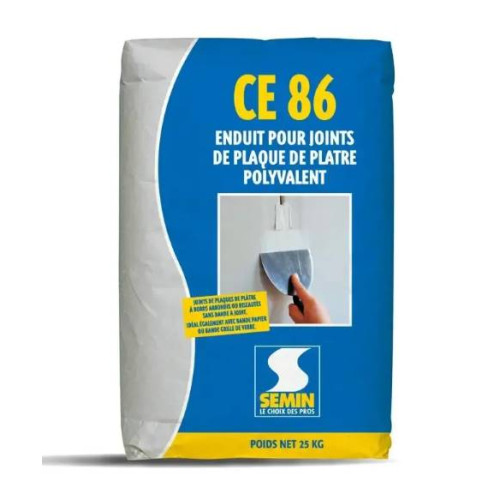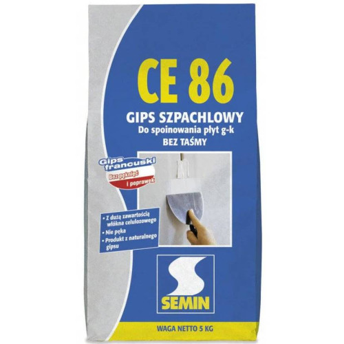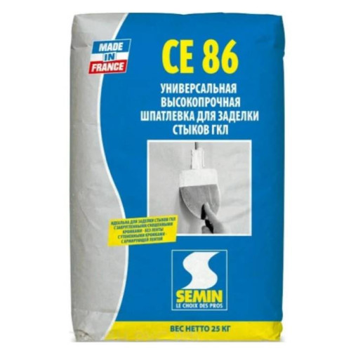 SEMIN CE-86, Шпаклевка гипсовая финишная для швов Многофункциональная, трещиностойкая шпаклевка длявнутренних работ. Специально создана для заделки стыков ГКЛ (ГВЛ) с полукруглой или срезанной кромкой без применения армирующей ленты. Так же эффективна для заделки стыков с утоненной кромкой с использованием армирующей ленты. СЕ 86 в равной степени подходит для всех видов работ: предварительное выравнивание, финишная отделка, ликвидация выбоин, щелей и трещин, фактурная (декоративная) отделка. ..
