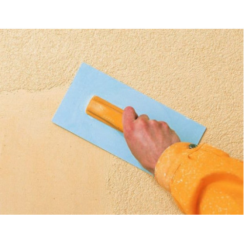 Декоративная штукатурка на подготовленную поверхность наносится при помощи стальной терки под углом в 60 градусов. Для плотного размещения зерен можно наносить штукатурку круговыми движениями, держа щетку параллельно поверхности. При необходимости в перерыве в рабочем процессе следует заклеить край клейкой лентой, а перед возобновлением работы удалить ее.