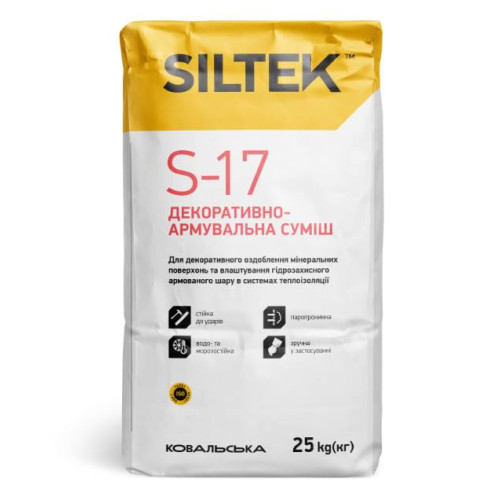 Siltek S-17, Декоративно-армирующая смесь, 25 кг Для устройства декоративно-защитного слоя в системе фасадной теплоизоляции, в том числе при применении минераловатного утеплителя и фактурной отделки минеральных поверхностей стен и потолков внутри и снаружи зданий перед нанесением водно-дисперсионных красок. Имеет мелкозернистую фактуру, возможна шпаклевка и выравнивание старых структурных штукатурок, а также финишного выравнивания поверхностей. Свойства: – ручного и меха..