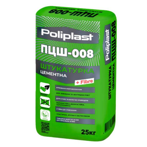 Полипласт ПЦШ-008, Штукатурка цементная, 25 кг. готовая сухая штукатурная смесь, применяемая для толстослойного чернового выравнивания и оштукатуривания стен и потолков, фасадов зданий и других несущих гигроскопических оснований, устойчивых к деформации (кирпич, легкий бетон, бетон и др.), перед шпатлевкой или устройством отделочных работ. ремонта старых штукатурок. Предназначена для ручного метода нанесения. Свойства: армированная фиброволокном для ручного нанесения для наружных..