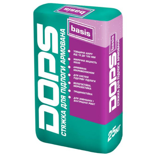 DOPS Basis, Стяжка напольная армированная, 10-100 мм, 25 кг – Стяжка для пола армированная DOPS Basis – предназначена для устройства традиционной черновой стяжки и предварительного выравнивания полов по деформируемым основаниям (цементные, бетонные, керамзитобетонные и другие) перед последующей укладкой финишных покрытий после монтажных или в процессе ремонтных работ. В структуре материала содержатся микроволокна, минимизирующие образование трещин и усадку. Наносится толщи..