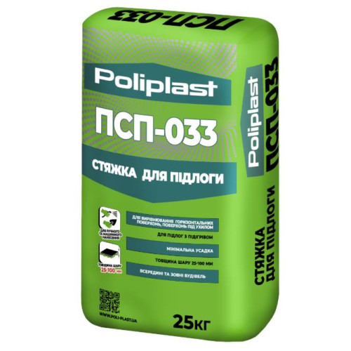 Полипласт ПСП-033, Стяжка для пола, 25-100 мм, 25 кг – Стяжка для пола ПСП-033 Standard – готовая сухая смесь для устройства стяжек, стяжек под уклоном, выравнивание и ремонт прочных оснований, устойчивых к деформации (цементные, бетонные, керамзитобетонные и другие) перед нанесением нивелирующих смесей, укладкой плитки, паркета, лама. Используется внутри сухих или влажных помещений и снаружи зданий (при добавлении концентрированной эмульсии ПЛ-127 и последующего устройства гидроизоляции). Мо..