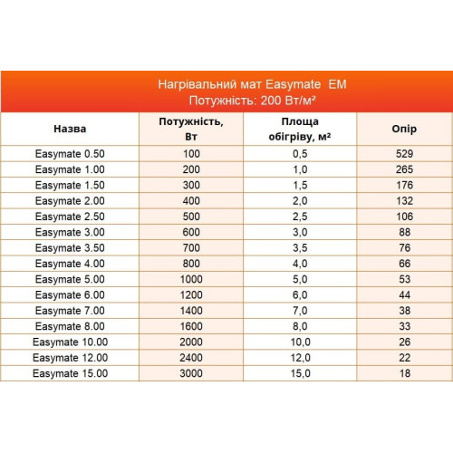 | Наименование | Мощность, Вт | Площадь обогрева, м2 | Сопротивление |