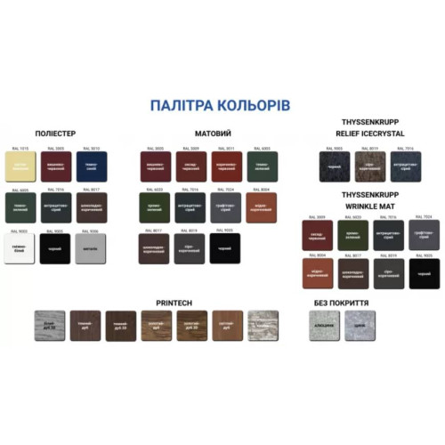 | Цвет | палитра RAL или с принтом (текстура дерева) |